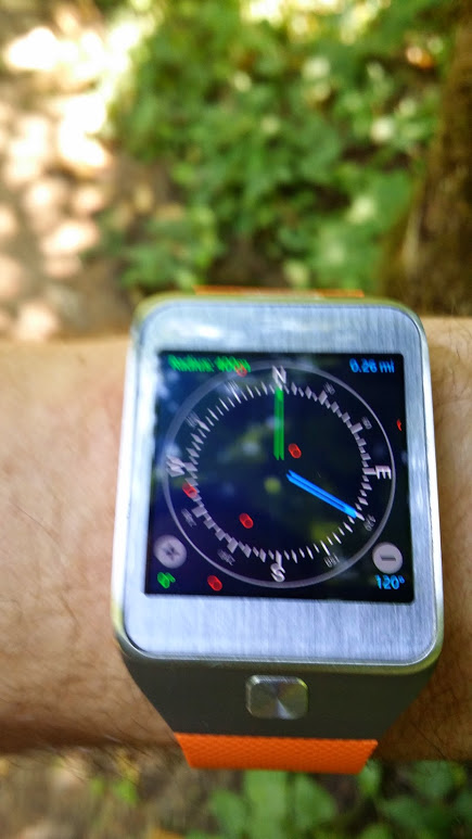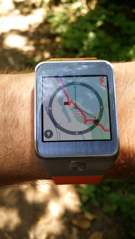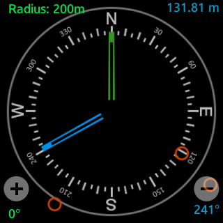 Compass View of your current heading and a pointer to a GOTO waypoint that you have chosen in BackCountry Navigator. (This uses moving direction from GPS; we'll be able to use compass direction in other hardware like the Gear Live).