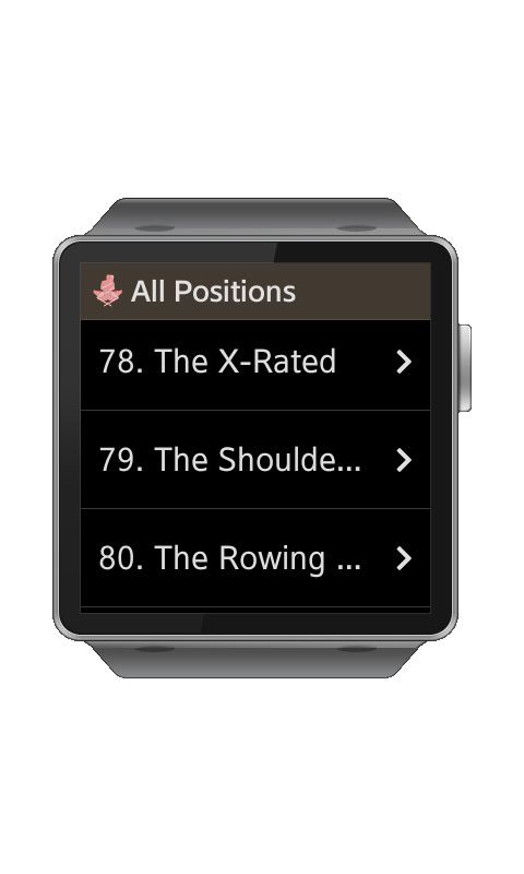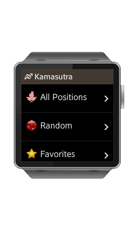 Kamasutra for Samsung Gear has 100 sex positions with illustrations and descriptions. You can set each each position to your favorites and/or tried lists to access them back quickly.