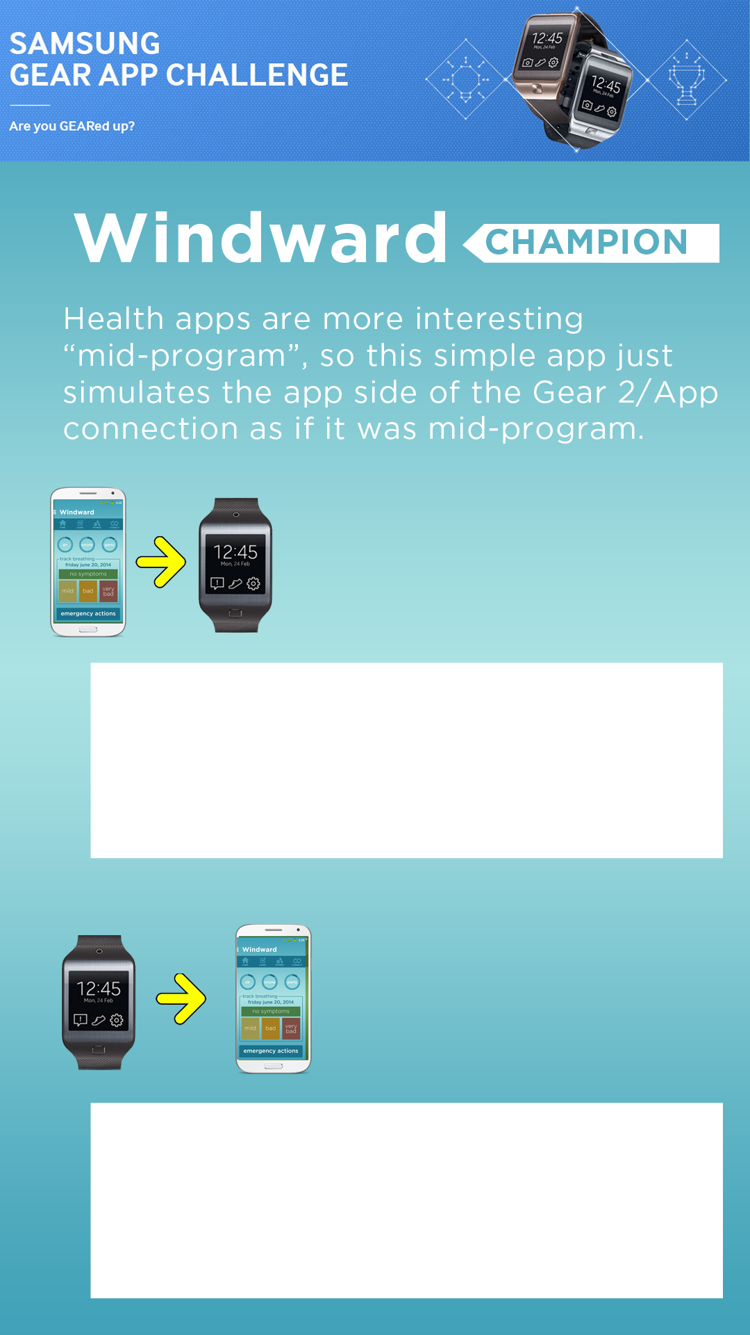 For Phase I of the Samsung Gear App Challenge we submitted an app to pair with the Gear 2 experience to simulate a “mid-program” data set. Health programs become more interesting as they progress. so for this initial evaluation of the Gear 2 experience the Samsung App will make the Gear 2 “act” like like it would after registration, initial data collection and other early experience requirements that would require more judge interactivity than we would most likely be allotted at this phase. This app will show you the data exchange with the Gear 2 and the Samsung Galaxy that would usually be “behind the scenes”. If we progress to the next round in the Challenge we will pair the Gear 2 experience with the full Windward Champion app and instructions for account creation and initial patient profile development.