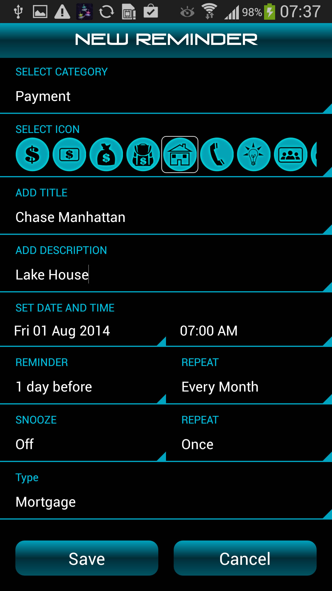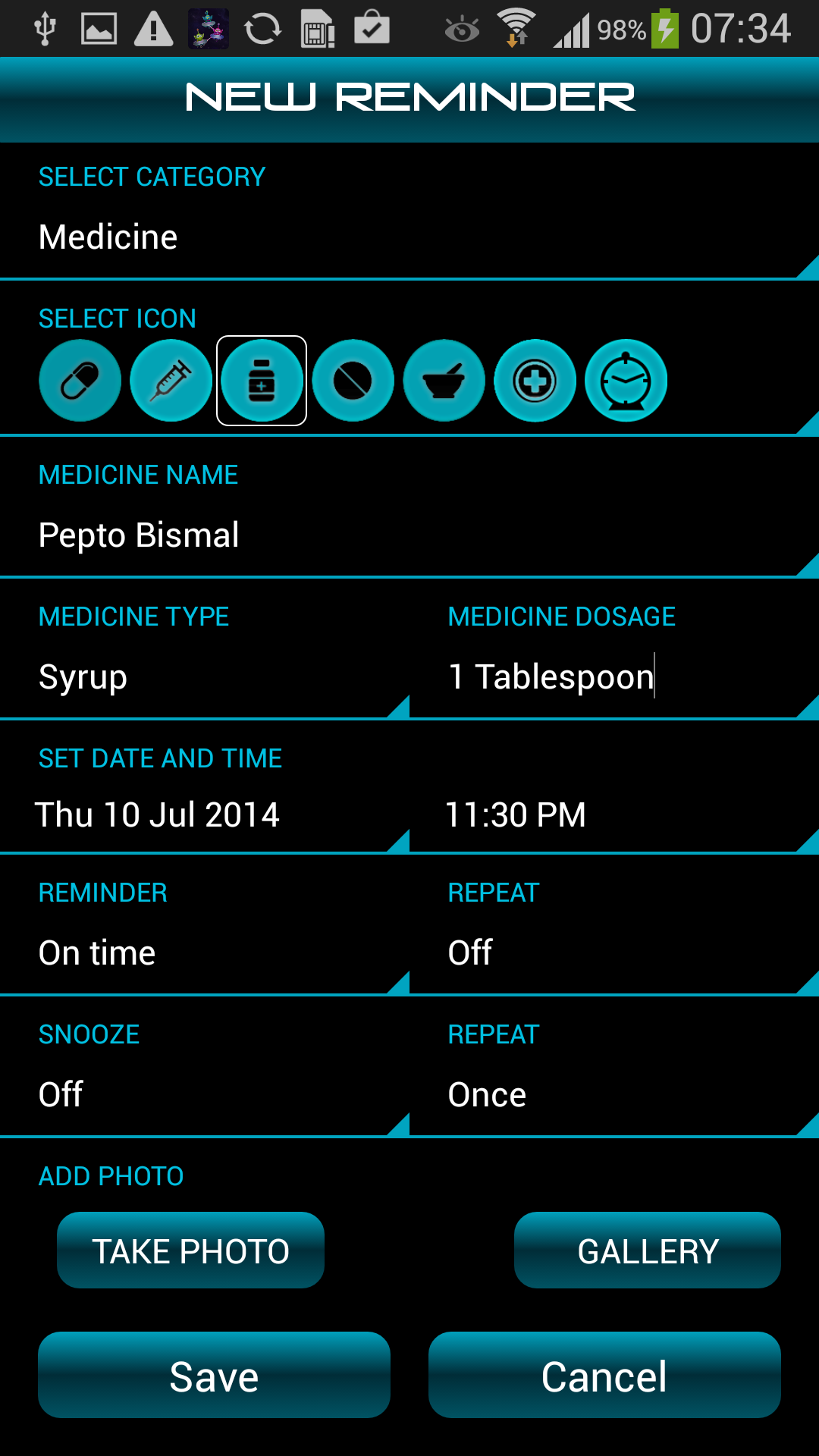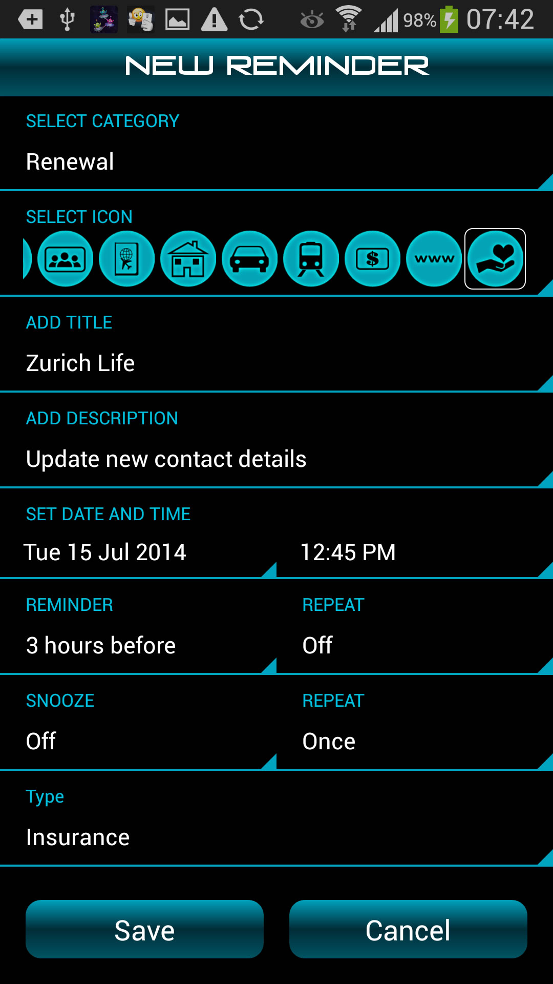 - Set up reminders for Appointments, Personal, Medicines, Renewals and Payments